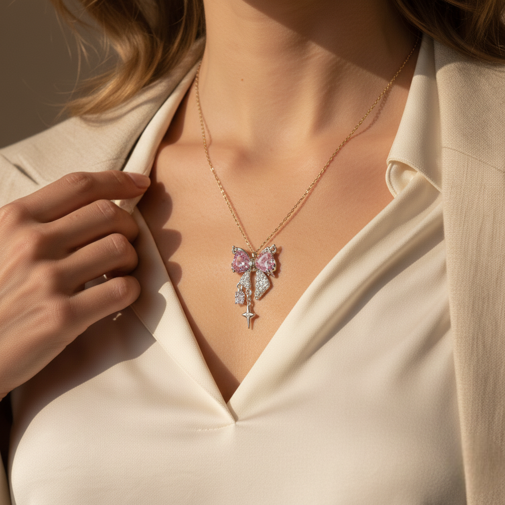 Delicate pink crystals shaped into a graceful bow, capturing softness, romance, and thoughtful intention — a timeless piece designed to celebrate love, beauty, and meaningful moments.